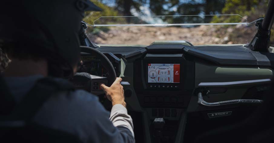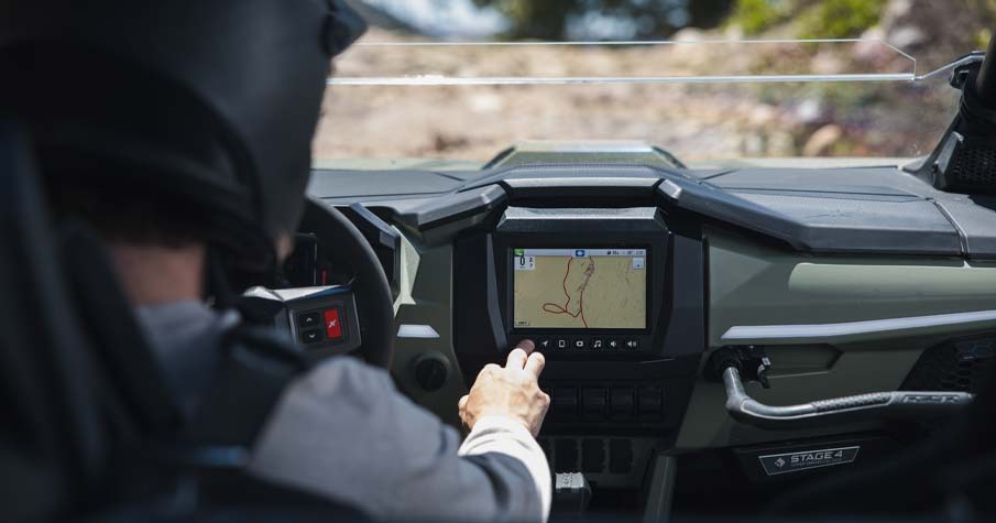 « Écran RIDE COMMANDMD de 7 po avec touche tactile résistif : Visualiseur DYNAMIX 2.0, GPS intégré, conduite en groupe (par téléphone cellulaire ou GPS), cartographie topographique, connectivité Bluetooth et USB pour téléphone intelligent, radio AM/FM et météo (haut-parleurs requis - vendus séparément), communications à bord du véhicule possibles avec casques d'écoute Sena en option, système antivol P.A.S.S. de Polaris. Cadrans analogiques à double balayage avec centre d'information du pilote à écran LCD de 4'' : Rétro-éclairage et luminosité bleu/rouge sélectionnables par l'utilisateur, intervalles d'entretien programmables. Instrumentation numérique : Indicateur de vitesse, tachymètre, compteur kilométrique, totalisateur partiel, horloge, compteur d'heures, indicateur de vitesse, jauge de carburant, température du liquide de refroidissement, voltmètre, indicateur et codes d'entretien, témoin de rappel de ceinture de sécurité, indicateur de vitesse, prise de courant continu.